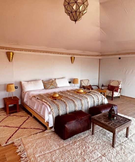 Vivez une expérience unique au cœur du désert grâce à nos tentes traditionnelles berbères, aménagées dans le respect des coutumes locales.